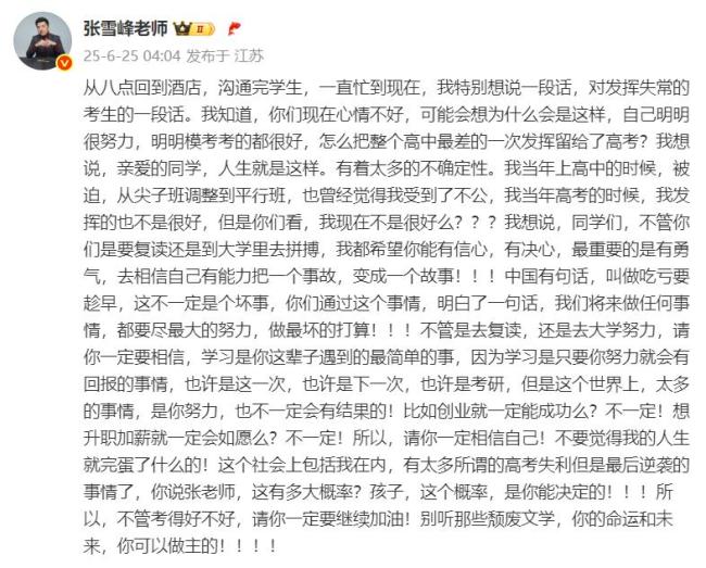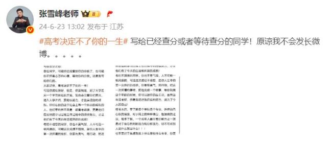 近日,各地高考成绩陆续公布。6月25日凌晨,考研名师、知名教育博主张雪峰在个人微博发布长文,鼓励高考发挥失常的考生。