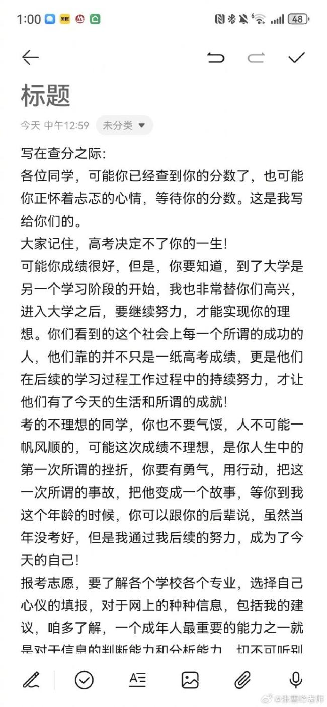 去年高考出分时,张雪峰也曾发布长文,带上话题词“高考决定不了你的一生”,表示考得不理想的同学不要气馁,人不可能一帆风顺,鼓励考生要有勇气、用行动把“事故”变成“故事”。