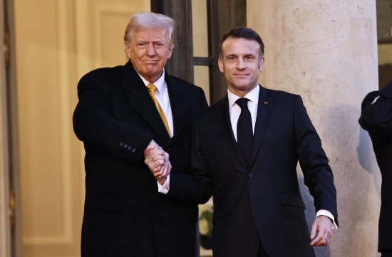 2024年12月7日,法国总统马克龙(右)在巴黎总统府爱丽舍宫欢迎受邀出席巴黎圣母院重新开放仪式的美国当选总统特朗普。新华社记者高静摄
