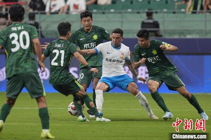 6月17日,在北京举行的2025赛季中国足球超级联赛第6轮(补赛)的比赛中,北京国安队主场1:0胜青岛西海岸队。图为青岛西海岸队球员戴维森(白衣)在比赛中带球。中新社记者 赵文宇 摄