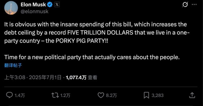 马斯克还在发文中批评共和党。他还称,是时候建立一个真正关心美国人民的新政党了。