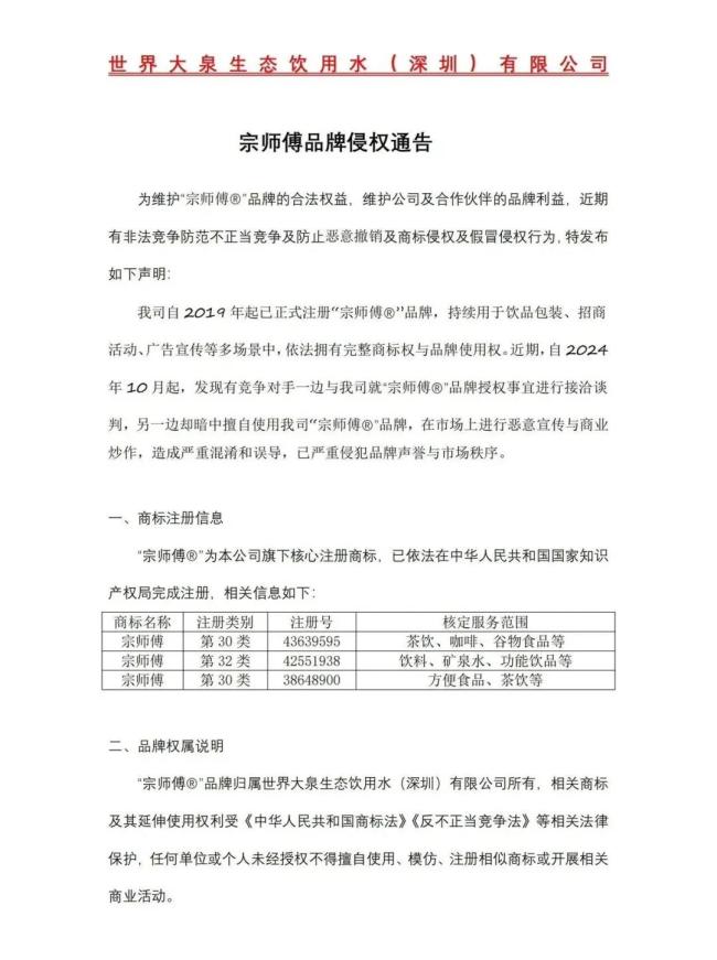 在“宗师傅”服务号的历史发文中,还有一则《关于近期冒用“宗师傅®”品牌行为的严正声明》,文中提到,“宗师傅®”为本公司(世界大泉)旗下核心注册商标……包括第30类和第32类。