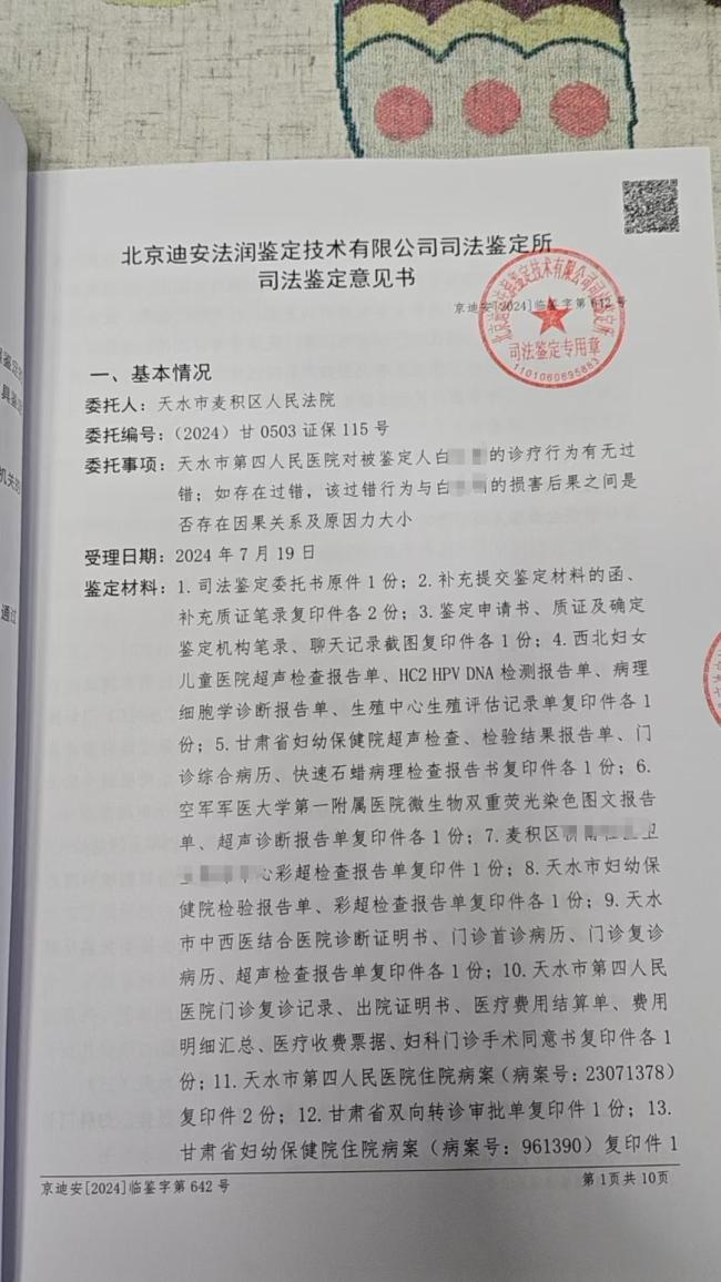 手术给白女士带来了身体的损伤和后遗症。经陕西津实司法鉴定中心于2025年6月18日出具的司法鉴定报告确认(受甘肃省天水市麦积区人民法院委托),白女士子宫穿孔修补术后构成十级伤残。她目前患有妇科疾病、盆腔积血等问题。医生告知她,若不进行输卵管复通手术将无法怀孕,但即使手术成功怀孕几率也很低。身体的伤痛直接影响了她的婚姻生活。“我现在这个样子,妇科方面有问题,同房都会痛,”白女士表示,“我现在跟我老公关系很差,现在真的是凭良心在生活。”