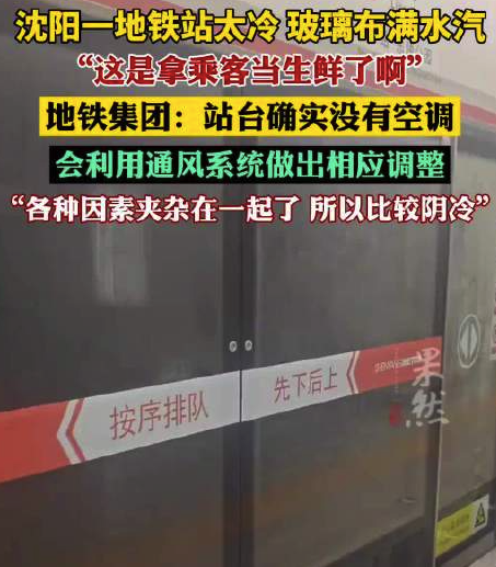 6月30日,辽宁省沈阳市地铁1号线东延线开通。当天有网友发视频称,该新开地铁线路中的水泉站地下温度较低,候车站台的屏蔽玻璃门上出现了大面积水汽,在评论区有网友调侃称:“这是拿乘客当生鲜了啊。”记者注意到,在该视频评论区也有其他网友表示,水泉站地理位置靠近东陵地宫,可能因此温度较低。另有网友发布视频称,沈阳地铁1号线东延线东陵公园等站点也很冷。