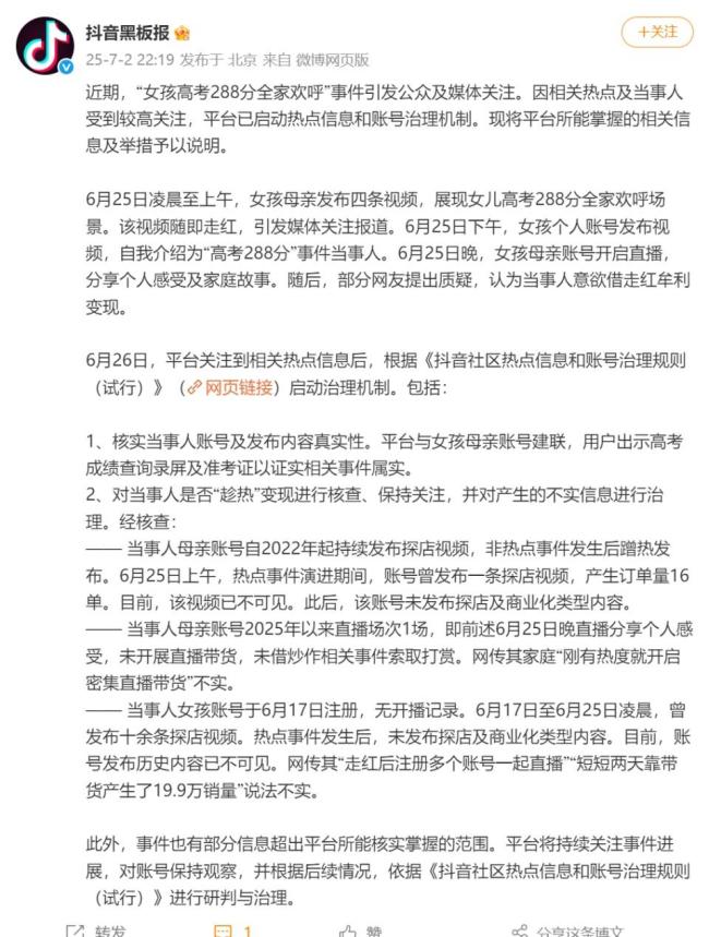 6月25日凌晨至上午,女孩母亲发布四条视频,展现女儿高考288分全家欢呼的场景。该视频迅速走红,引起媒体关注报道。当天下午,女孩个人账号发布视频,自我介绍为“高考288分”事件当事人。当晚,女孩母亲账号开启直播,分享个人感受及家庭故事。随后,部分网友质疑当事人意欲借走红牟利变现。