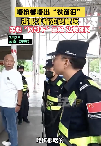 逃犯嚼槟榔牙痛难忍就医边境落网。7月2日,云南西双版纳,嚼槟榔嚼出“铁窗泪”,逃犯牙痛难忍就医,奔驰“网约车”露陷边境落网。
