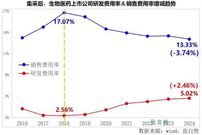 据wind数据统计,在实行集采前,生物医药上市公司销售费用率不断增长,实行集采后,销售费用率逐年下滑,已由2018年的17.07%下降到了2024年的13.33%,6年下降了3.74个百分点。