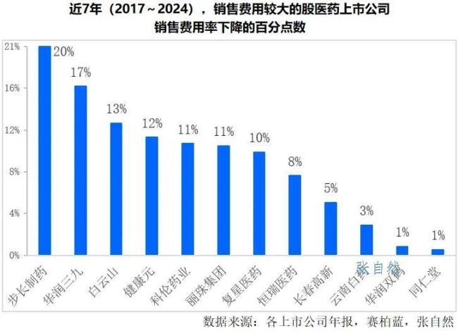 与集采前一年的2017年相比,2024年销售费用率降幅最大的是步长制药,7年下降了20个百分点。其次是华润三九,下降了17个百分点;