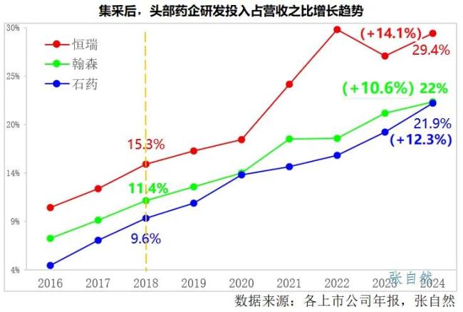 如恒瑞的研发费用率由集采之初2018年的15.3%提高到了2024年的29.4%,6年增加了14.1个百分点;