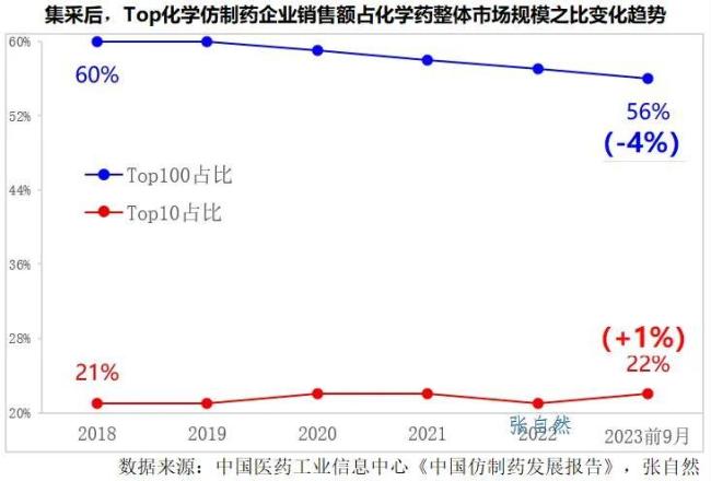据中国医药工业信息中心统计,2018年,全国百强(Top100)化学仿制药企业的销售额在全国化学药整体市场规模的占比为60%,到2023年9月,这一占比已下降到了56%,5年下降了4个百分点;