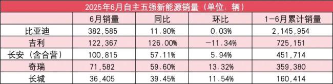 在这一背景下,6月份自主5强(比亚迪、吉利、长安自主、奇瑞、长城)销量全部呈现同比正增长。在这5家之中,比亚迪依旧以38万+的排在第一;其余4家的排名也已经连续多月固定,形成了吉利、奇瑞、长安自主、长城这样的梯队。其中,吉利、奇瑞两家连续4个月销量超20万;长城也稳定在10万辆以上;长安自主销量则波动较大。