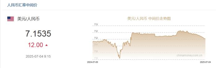 中新网7月4日电 据中国外汇交易中心网站消息,中国人民银行授权中国外汇交易中心公布,2025年7月4日银行间外汇市场人民币汇率中间价为:1美元对人民币7.1535元,下调12个基点。