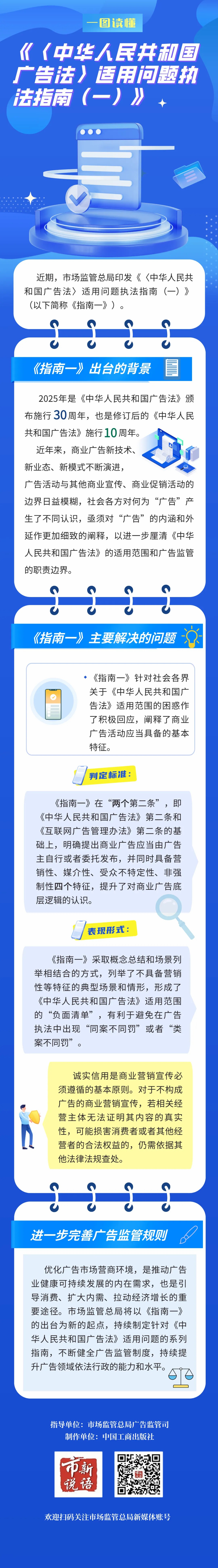 中新网7月4日电 据市场监管总局官方微信消息,近日,为进一步规范广告领域涉企执法行为,有效区分商业广告和其他商业营销宣传,市场监管总局印发了《〈中华人民共和国广告法〉适用问题执法指南(一)》(以下简称《指南一》),为市场监管部门准确适用《广告法》《互联网广告管理办法》等法律法规打牢坚实基础。