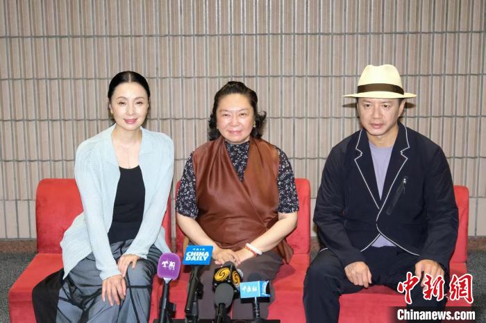 7月3日,中国国家话剧院院长、话剧《四世同堂》导演田沁鑫(中),话剧《四世同堂》演员陶虹(左)和段奕宏(右)在香港文化中心接受记者采访。中新社记者 陈永诺 摄