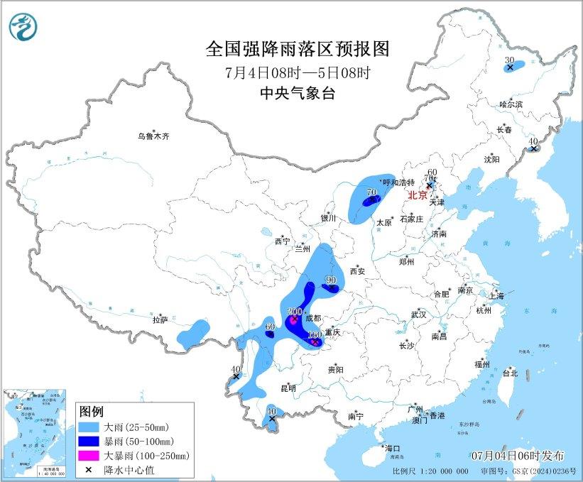 预计,7月4日8时至5日8时,内蒙古河套地区、甘肃东部、宁夏南部、陕西北部和西南部、山西北部、四川盆地西部和南部、云南西部、西藏东部等地部分地区有大到暴雨,其中,四川盆地西部和南部等地局地有大暴雨(100~200毫米)。上述部分地区伴有短时强降水(最大小时降雨量20~50毫米,局地可超过70毫米),局地有雷暴大风等强对流天气。