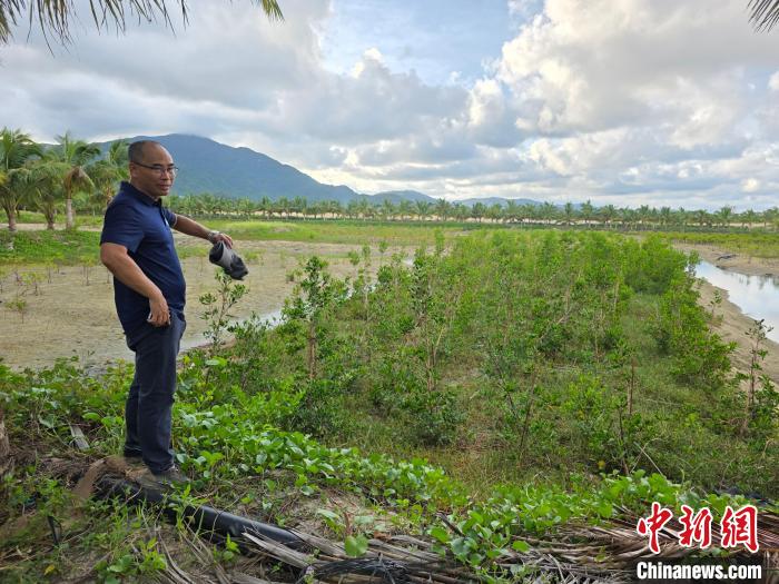 6月24日,钟才荣指着三亚一处人工种植区对记者说,眼前这片是全海南岛红榄李长得最快的区域,两年前种下的数百棵红榄李已经高过成人,能够正常开花结果,证明人工回归种植技术可行。