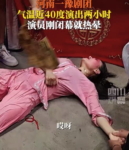 7月5日,河南林州。豫剧演员在近40度高温演出2小时,刚闭幕就热晕。剧团负责人说演员坚持完成了表演,后来抬到空调屋情况得到缓解。