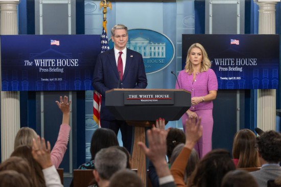 4月29日,美国白宫新闻秘书卡罗琳·莱维特(右)与美国财政部长斯科特·贝森特在华盛顿白宫出席记者会。新华社记者 胡友松 摄