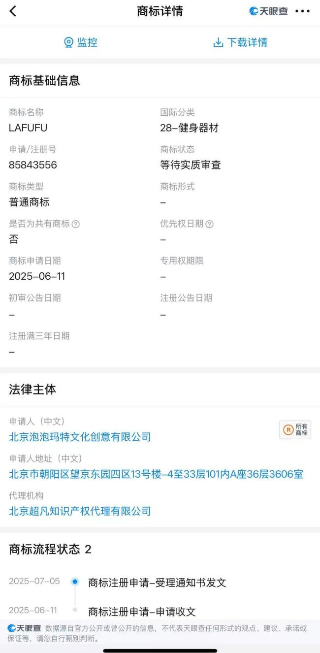 7月7日,天眼查商标查询信息显示,北京泡泡玛特文化创意有限公司于6月11日申请注册了“LAFUFU”商标,国际分类为健身器材,当前商标状态为等待实质审查。据知情人士透露,LAFUFU商标属于主动防御性注册,目的是为了更好地打击侵权行为。