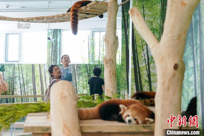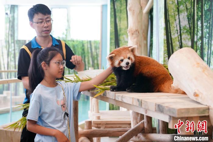 图为小朋友与小熊猫互动。中新社记者 赵宇航 摄