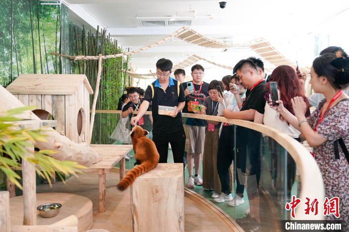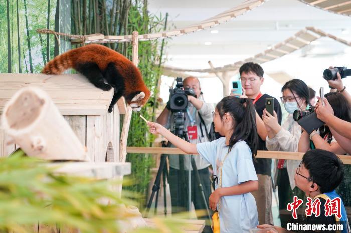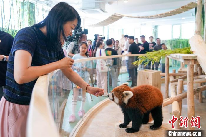 图为游客与小熊猫互动。中新社记者 赵宇航 摄