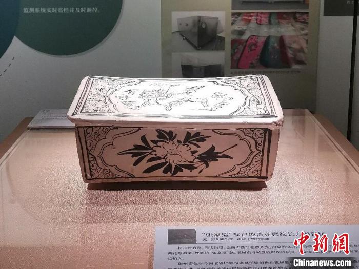 出自元代河北磁州窑的“张家造”款白地黑花狮纹长方形瓷枕十分精美,其周边出檐,中部有菱形开光,内绘狮纹。开光外满饰花卉。四侧枕壁也有菱形开光,里面分别绘有牡丹、荷花等图案。枕底钤“张家造”款。