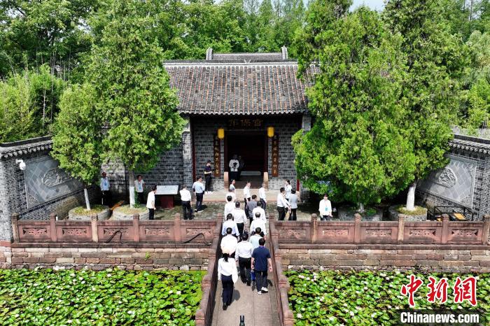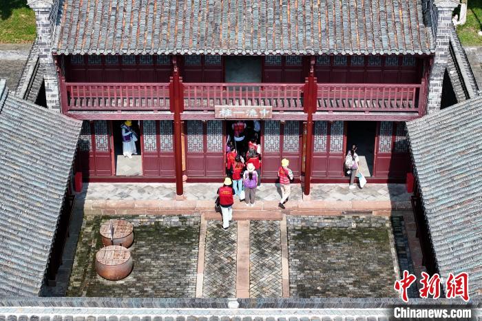 图为学生代表走进刘铭传故居参观。(无人机照片)中新社记者 韩苏原 摄