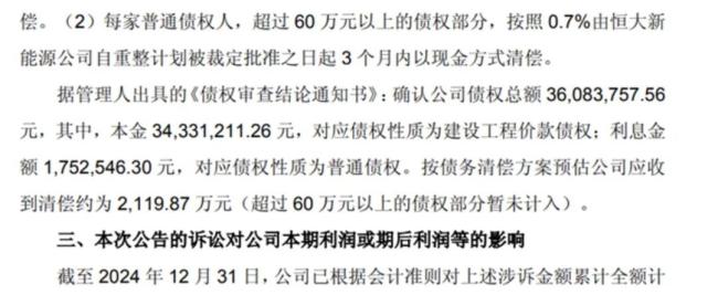 截至去年年末,金桥信息公司已对涉诉(恒大新能源汽车)金额全额计提各项资产减值准备共计3832.87万元。公司预计本次清偿金额执行后,将冲回上述部分资产减值准备,对公司相应年度利润的影响金额约为2119.87万元。