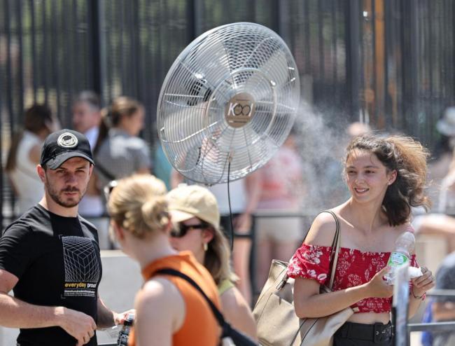 2025年6月27日,在意大利罗马,游客在斗兽场附近一处风扇下纳凉。新华社记者李京摄