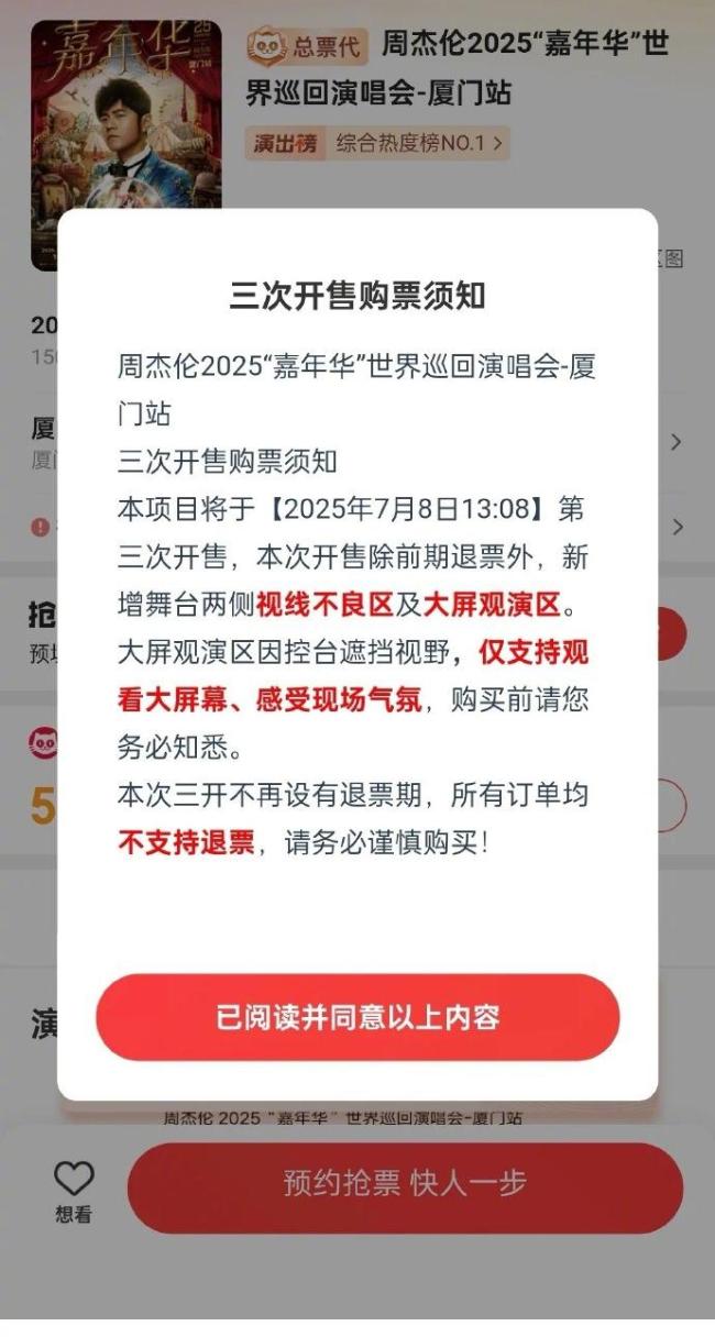 7月7日,红星新闻报道,周杰伦2025“嘉年华”世界巡回演唱会厦门站门票即将第三次开售。此次新增了舞台两侧视线不良区及大屏观演区的票种,售价分别为900元和500元。