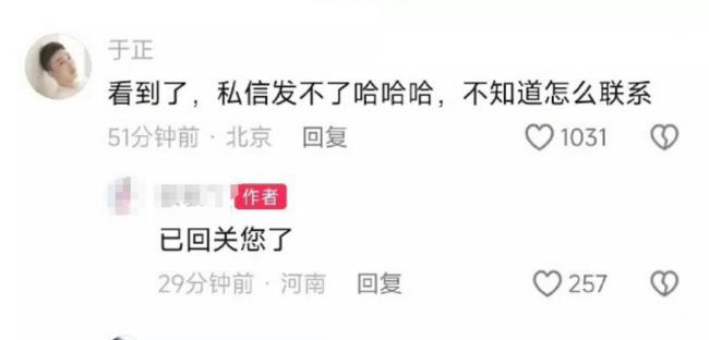 有网友在女孩妈妈的账号评论区邀请于正来看这位女孩。随后,于正在评论中表示:“看到了,私信发不了,不知道怎么联系。”女孩妈妈回复说已经回关了于正。