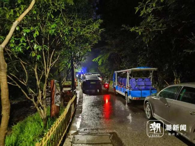 晚上8点15分,记者在九溪烟树附近看到许多救援车灯光闪烁。卡口执勤人员表示,下午发现有人员被困,但由于雨势太大,具体情况尚不清楚。几位刚从山上下来的游客也劝说记者不要上去,因为正在进行救援,滞留的人较多。