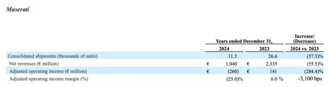 玛莎拉蒂在全球范围内的销量表现同样不佳。母公司Stellantis集团2024年财报显示,玛莎拉蒂全球销量从2023年的26689辆下滑到14725辆,降幅超40%。销量几近腰折背景下,玛莎拉蒂2024年的净收入、调整后营业收同样下滑。