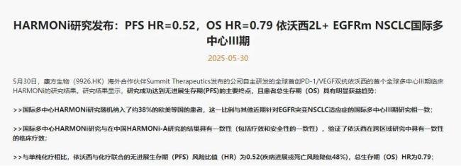 一个多月前(5月30日),康方生物海外合作伙伴Summit公布了依沃西单抗首个全球多中心Ⅲ期临床HARMONi的研究结果。其在全球HARMONi临床EGFR突变非鳞非小细胞肺癌(NSCLC)二线治疗临床的结果“不及预期”。市场争论主要集中在OS指标上。
