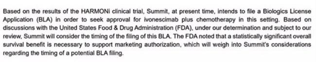 另一部分人认为,这个结果可能会给依沃西单抗在美国上市带来极大不确定性。在Summit公告中,基于HARMONi临床试验的结果,Summit虽然已明确表示计划提交生物制品许可申请(BLA)。但FDA指出,统计学显著的总生存期获益是支持上市授权的必要条件,这显然将影响Summit提交产品BLA时间。