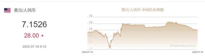 中新网7月16日电 据中国外汇交易中心网站消息,中国人民银行授权中国外汇交易中心公布,2025年7月16日银行间外汇市场人民币汇率中间价为:1美元对人民币7.1526元,下调28个基点。
