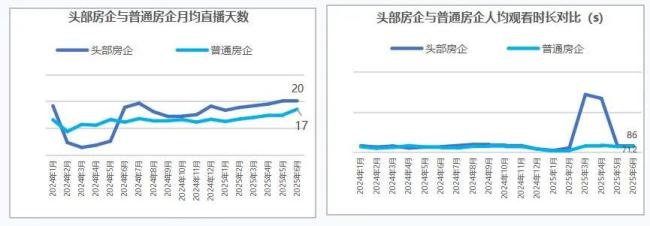 比如在今年六月,头部房企直播天数均值为20天,较普通房企多了3天;头部房企人均观看市场为86s,普通房企为71s。