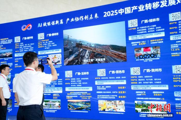 7月20日,2025中国产业转移发展对接活动(广西)在南宁启幕。图为广西各地市的推介内容吸引参会者。陈冠言 摄