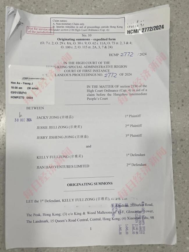 娃哈哈创始人宗庆后之女、现任董事长宗馥莉近期因资产纠纷在香港被起诉,三名原告是宗继昌(Jacky Zong)、宗婕莉(Jessie Zong)和宗继盛(Jerry Zong)。三位“同父异母弟妹”要求冻结宗馥莉名下香港汇丰银行账户内约18亿美元资产,并追索父亲生前承诺的21亿美元信托权益(约150亿元人民币)。此外,前述原告还在杭州中级人民法院提起诉讼,要求确认其对宗馥莉持有的娃哈哈集团29.4%股权的继承权。