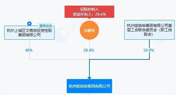另外一个备受关注的问题是,娃哈哈集团不是一个纯粹的民营企业。杭州上城区文商旅投资控股集团有限公司持有娃哈哈集团46%的股份,是其第一大股东。