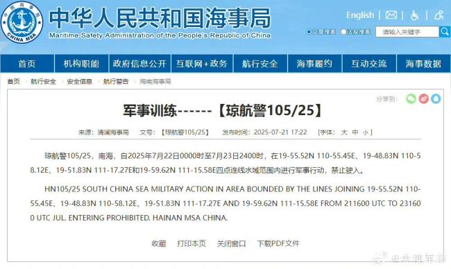 南海部分水域军事训练禁止驶入。据中国海事局网站消息,清澜海事局发布航行警告,7月22日0时至7月23日24时,南海部分水域进行军事训练,禁止驶入。