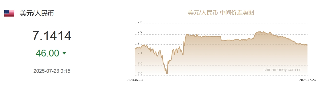 中新网7月23日电 据中国外汇交易中心网站消息,中国人民银行授权中国外汇交易中心公布,2025年7月23日银行间外汇市场人民币汇率中间价为:1美元对人民币7.1414元,上调46个基点。