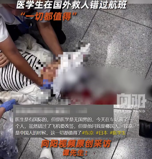 7月24日,谭先生在日本乘坐新干线前往机场时,突然听到有人呼救,他立即放下行李前往伤者处。在现场,有工作人员拿着药箱施救,但谭先生发现他们不太专业,于是上前给伤者做了包扎清创。谭先生称,伤者是发夹挫裂伤,救人后被询问来自哪个国家,告知他们自己是中国人后,他们都献上了夸奖,非常激动。
