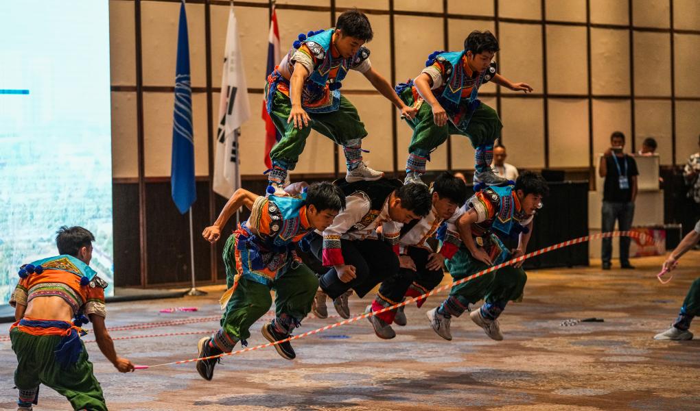 7月24日,演员在2025中国-东盟教育交流周青少年跳绳邀请赛开幕式上表演花样跳绳。新华社记者 陶亮 摄