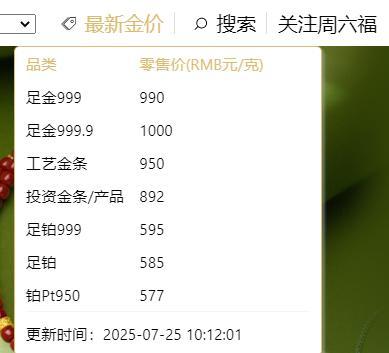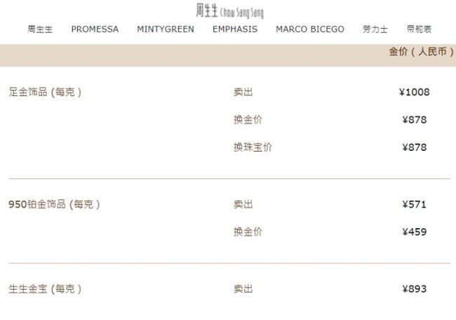 受此影响,国内金饰价格普遍下跌,多数品牌单克价格降至千元附近。老庙黄金价格降至1004元,两天内下降了19元;周生生金饰价格降至1008元,两天内下降了21元;老凤祥金价为1008元/克,两天内下降了16元;周大福足金价格降至1010元/克,两天内下降了13元;周六福足金999价格降至990元/克,两天内下降了13元,足金999.9价格为1000元/克。