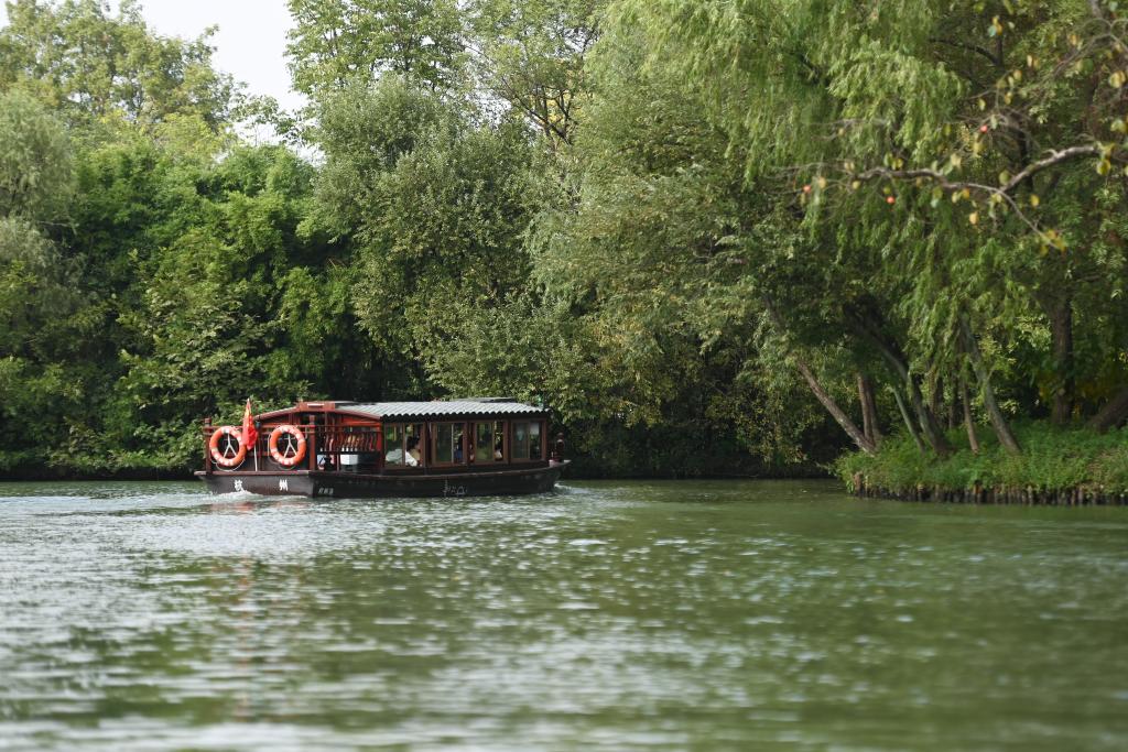 2024年10月24日,游客乘坐游船在浙江杭州西溪湿地观光。新华社记者黄宗治摄