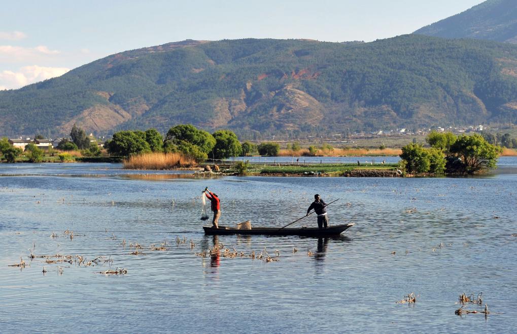 2014年2月19日,两名白族渔民在云南省大理白族自治州洱源县西湖国家湿地公园劳作。新华社记者蔺以光摄