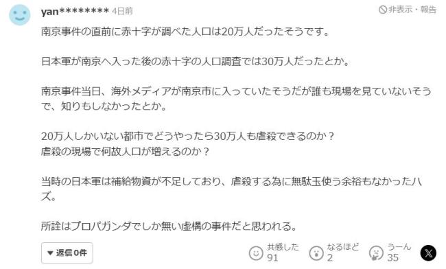此外,部分评论还复述了所谓“进入南京的外国媒体没有亲眼目睹屠杀过程”以及“日军物资匮乏,无法进行大规模屠杀”的观点,进一步否认南京大屠杀的真实性。