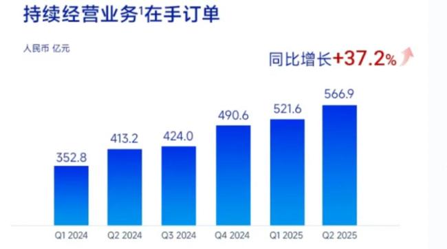 订单作为业绩的领先指标,上半年也有出色表现。截至2025年中,持续经营业务在手订单共566.9亿,同比增长37.2%。