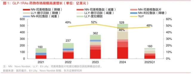 对比同期全球900-950亿的多肽药物市场,GLP-1占比超过50%,且贡献了超80%的增量,是全球多肽类药物销售额增长的第一引擎。
